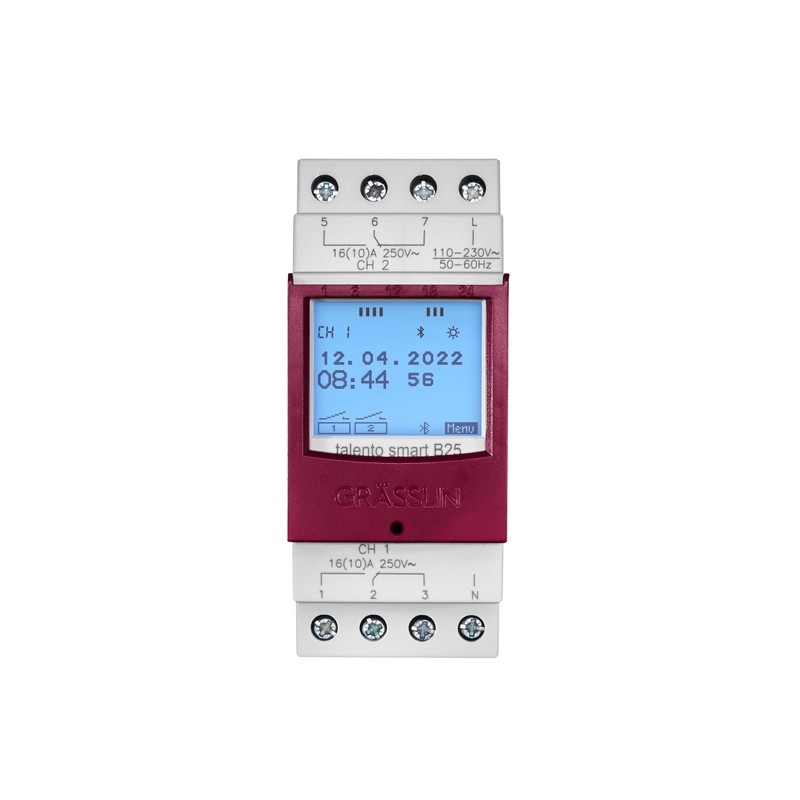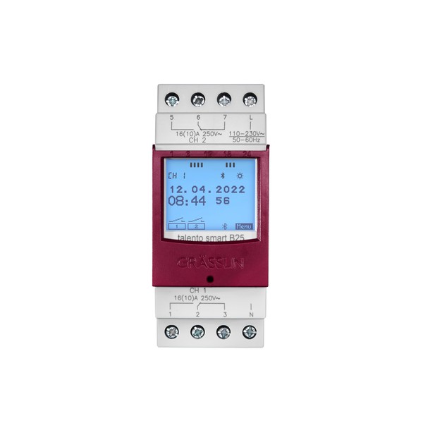 GRÄSSLIN Talento Smart B25 43.02.0002.1 Digital Timer with Bluetooth and App Programming I 2 Channel I 2TE I 100 Memory Spaces I Mounting on DIN Rail I LED 600 W