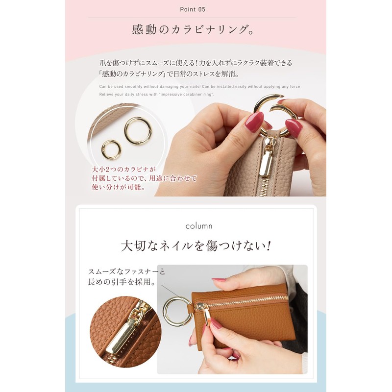 - (Includes a large and small carabiner for easy on/off) Comes with a large and small carabiner that will not damage your precious nails, so you can easily attach it to your bag or other items. There are 2 small key rings inside which can be used to hold multiple keys