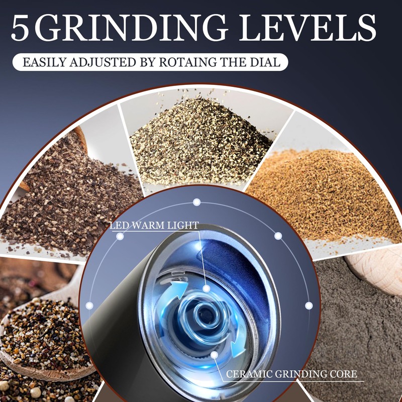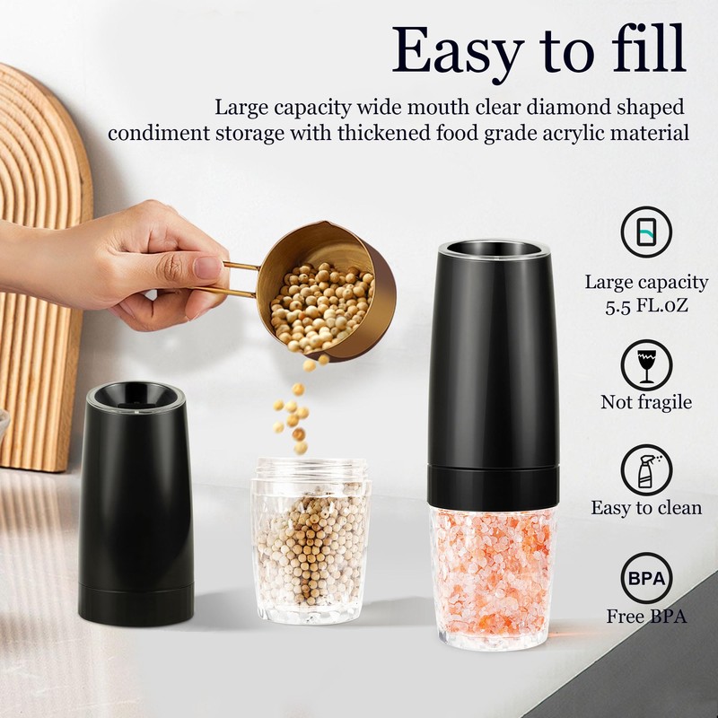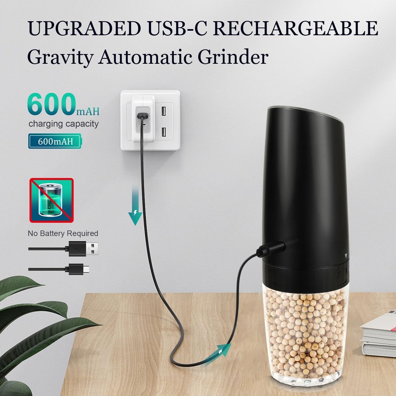 - 【CONVENIENT ONE-HANDED OPERATION】Rechargeable Gravity Seasoning Grinder Set with Gravity Sensor Switch All you have to do is tilt the salt and pepper grinder and it will automatically start grinding, equipped with a warm LED light to easily see the dose of seasoning to sprinkle, and twist the body of the grinder to turn on the gravity-sensing mode before the first time you use it.