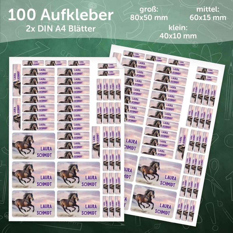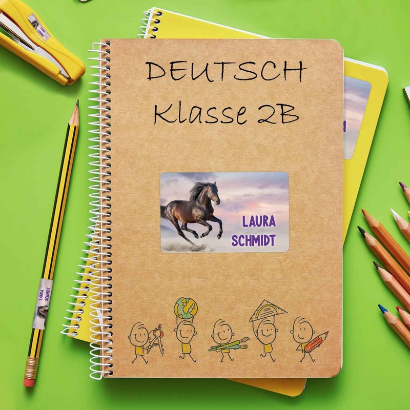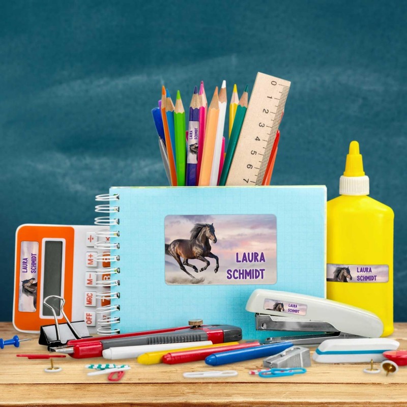GRAVURZEILE School Labels – Horse Design – Personalised with Name – 100 Stickers in 3 Sizes for Labelling School Supplies Books – Gift for First Day of School