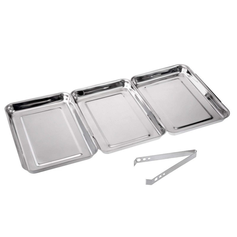 - Breading bowls set of 3, stainless steel 18/10 stainless steel (chrome nickel steel), dimensions of each bowl: 30.5 x 20.5 cm, height: 3 cm, length of breading road. Approx. 62 cm, including tongs, dishwasher-safe, rust-proof, stackable