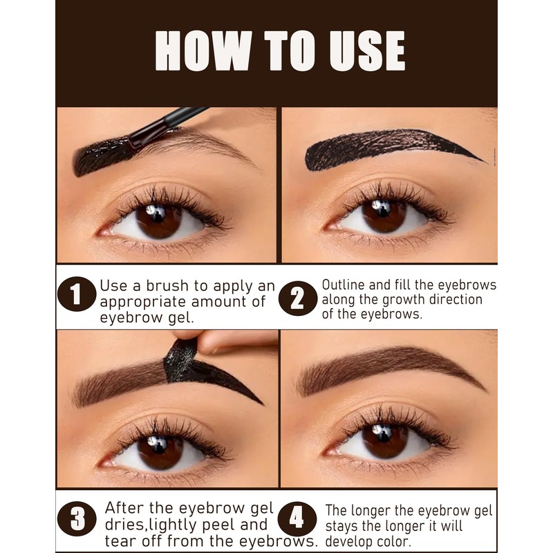 - Easy to Color & Peel off - Use the brow brush to apply a layer of brow gel to your brows, ensuring even coverage. Wait 20 minutes and peel off to reveal fuller, more refined brows. Note: If you want long-lasting brows, do not use cleansing products or heavy application on your brows for 24 hours. Use this product correctly and enjoy up to 3 days without coloring your brows.