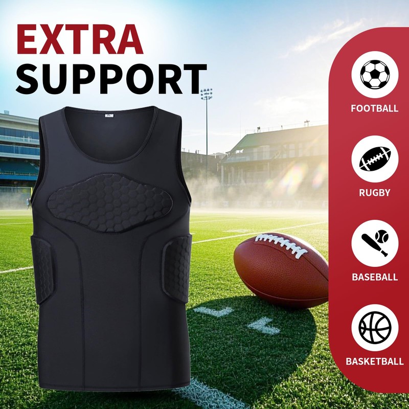 - IMPACT PADDED PROTECTION:Padded basketball compression shirt With 4 high - density EVA foam padding, 10mm pad thickness is more conducive to protecting your chest, waist and back. The special honeycomb pad shape allows impact force to be effectively dispersed. The honeycomb structure, while ensuring strength, has efficient material distribution, which can reduce the weight of the chest pad and the burden on athletes and ensuring sports flexibility