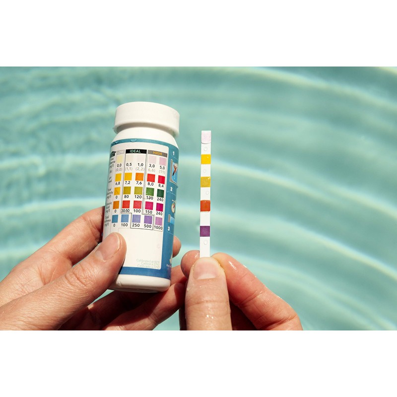 - Measures relevant parameters: total free chlorine content, pH, total alkaline content, stabilizer (cyanuric acid) and hardness.