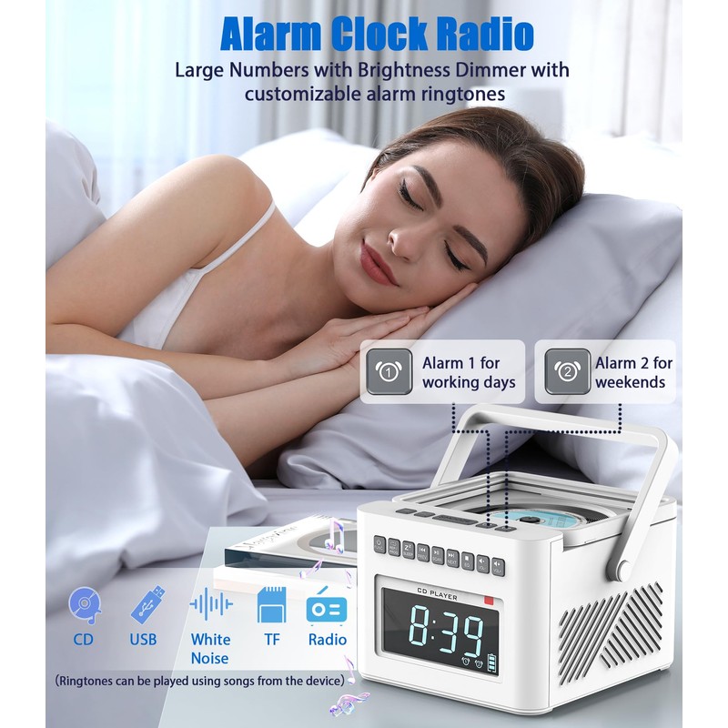 - 12-in-1 Digital Clock CD BoomboxThis boombox cd player features CD/Alarm Clock/Bluetooth/White Noise/Remote Control/FM Radio/AUX/TF/USB/Dimmer/Rechargeable/Large Screen