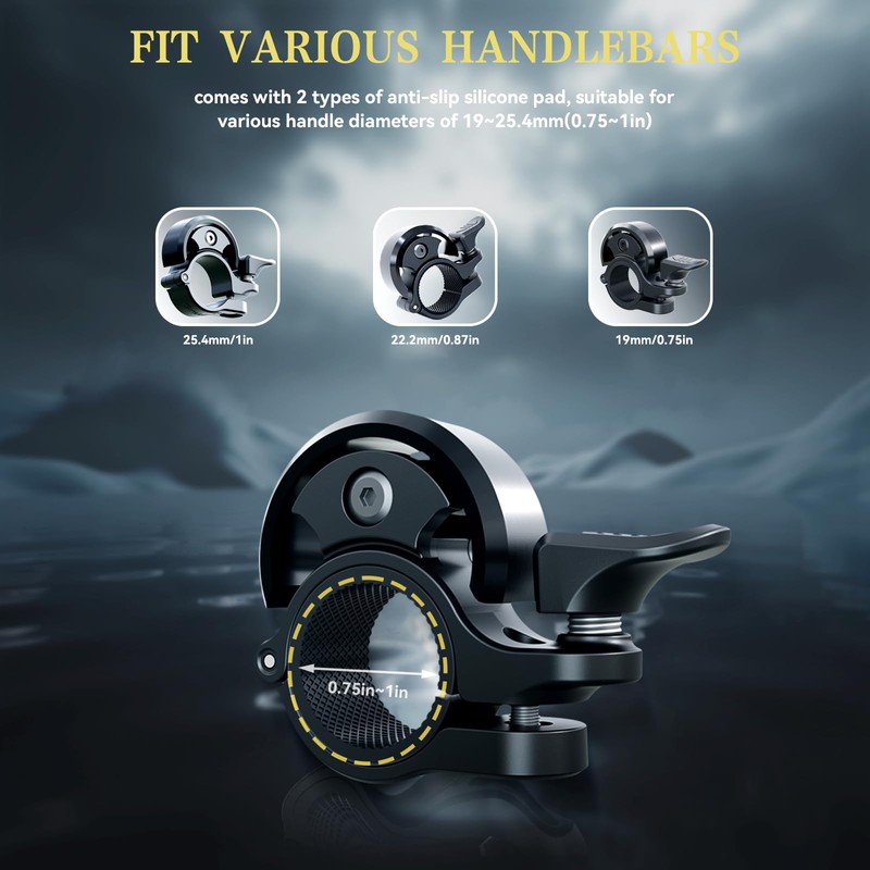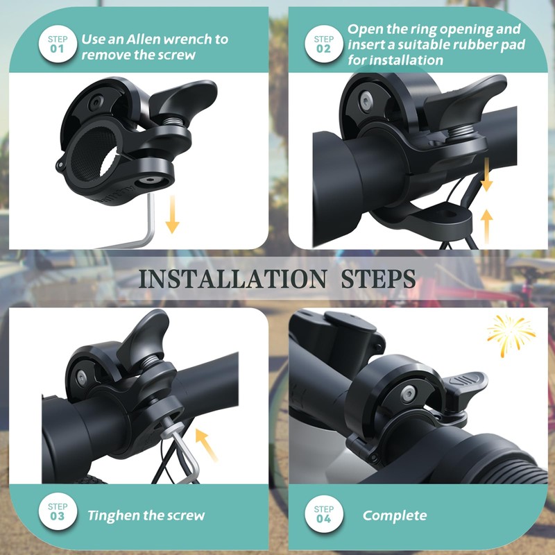 - Easy Installation: The compact, all-in-one bell design saves time and effort during installation. The package includes a hex key and two silicone pads (thick and thin), allowing you to choose the right thickness based on your bicycle handlebar size. The bicycle bell fits handlebars with a diameter of 19–25.4 mm.