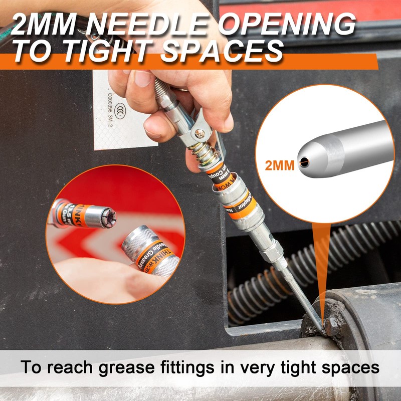 You'll Get - 0.53"Grease Gun Coupler and Narrow Needle Dispenser.The upgraded butter gun connector has a unique telescopic design. With just one hand pressing the handle, the six jaw jaws will extend forward. Align the jaws with the butter nozzle and push forward to lock it. Release the handle can be firmly bitten and locked. Save your money and be efficient! Design Ideas - 2MM narrow needle dispenser snaps directly onto a jaw type coupler to reach grease fittings in very tight spaces.Delivers a fine line of grease for shafts and other application. Our grease gun coupler is currently the smallest on the market with a diameter of only 0.53 inches and can be used in confined spaces. Designed with a single-lever for easy one-handed operation, you can easily and quickly lock and release. Upgrade Locking & Sealing - With the exclusive patent in the United States, THINKWORK upgraded grease gun coupler adopts upgraded powerful patented 6-jaw structure. With reinforced jaws & high-quality aviation-grade sealing gaskets, Tested at 12000 PSI pressure also prevents leaks. Fit All 1/8” NPT Fittings - Portable grease gun coupler are works on all DIN and SAE grease fittings and attaches to all 1/8” NPT standard grease guns, mini grease guns, pneumatic grease gun and electric grease gun. Wide Application - Our grease gun tool best choice for all-day performance in commercial shops, auto centers and any home garage. Perfect for use in automotive repair, job site large machinery and axles and drive trains. It is also ideal for lubricating farm tractors, plows, stump pullers, disc rakes, seeders, etc.