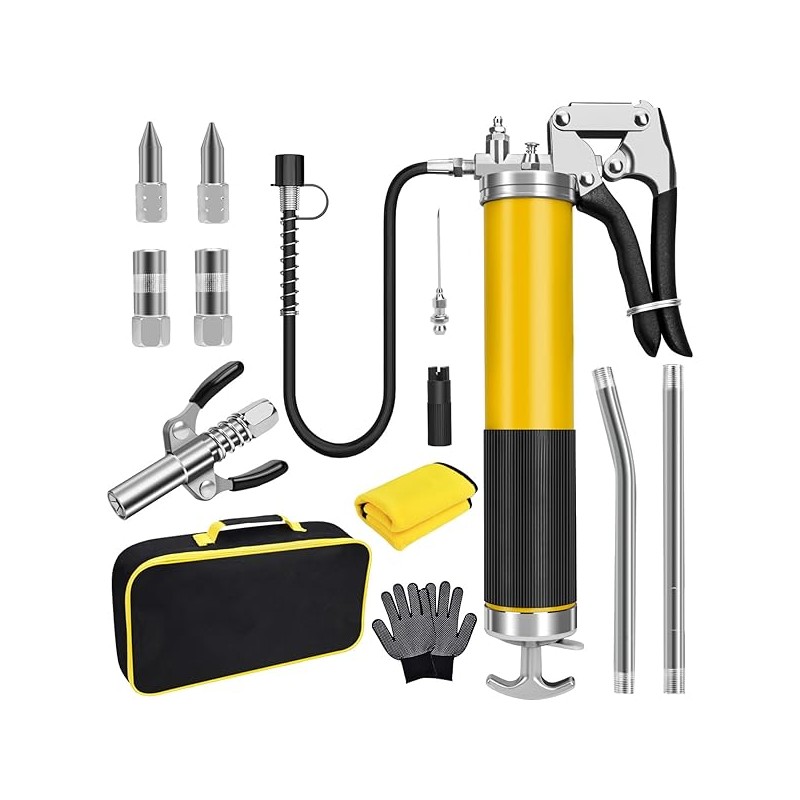 Grease Gun Kit, 7000 PSI Heavy Duty Pistol Grip Grease Gun with 14 oz Capacity, Includes 18 Inch Resin Flex Hose, Double Handle Grease Coupler and Other Accessories, Grease Gun for Automotive, Marine