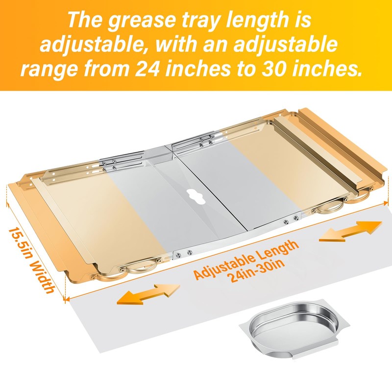 - Widely Compatible Drip Pan: Adjustable in width from 24 inches to 30 inches, our grease tray is compatible with multiple grill brands, including Dyna Glo, Nexgrill, Kenmore, Backyard Grill, BHG, Uniflame, and more. With a capacity of 400ml, it reduces the need for frequent cleaning or tray replacement, adding convenience to your grilling experience.