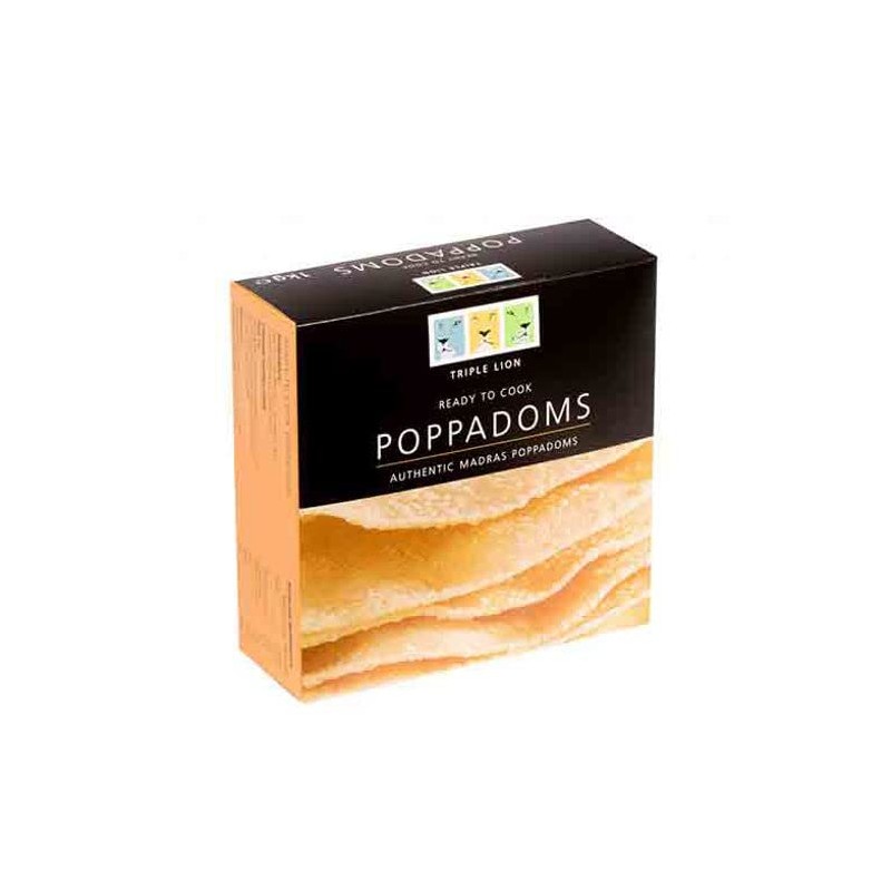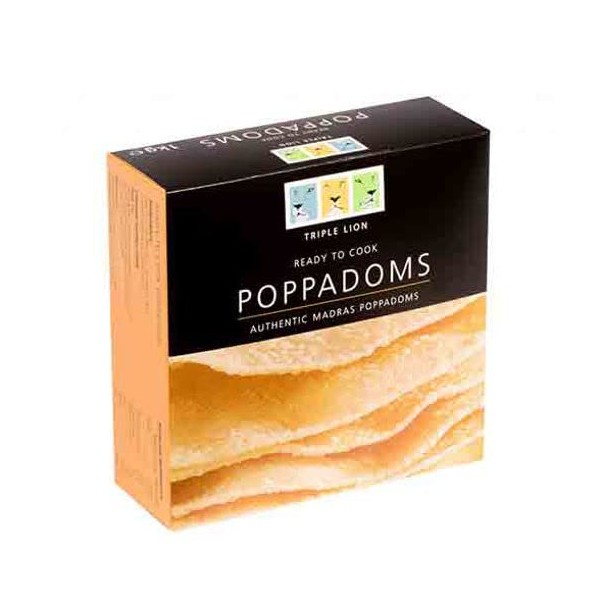 Triple Lion Poppadoms 1kg, Authentic Madras Poppadums. Ingredients: Urid Flour, Salt, Rice Flour, Anti-caking Agent (Calcium Carbonate), Sunflower Oil. Directions for use: Cooking Instructions Deep Fry : Carefully place individual poppadoms in a very hot oil for 2-3 seconds until they swell up. Remove with a fish slice and drain thoroughly. Microwave: Lightly brush both sides with oil or water and microwave on full power for 30-40 seconds.