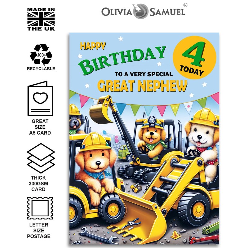 - GREAT NEPHEW KIDS DIGGER 4TH BIRTHDAY CARD ⭐ Fun colourful digger construction design with adorable doggies ⭐ Click the second image for the text inside the card.