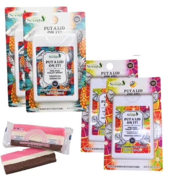 Great Scents Pre-Poop Toilet Spray 4 Pack, Tropical Hibiscus & Twisted Citrus Scents 0.67 fl oz Each, Odor Eliminator with Essential Oils Bathroom Air Freshener, with BONUS Barra de Arco-Íris de Coco