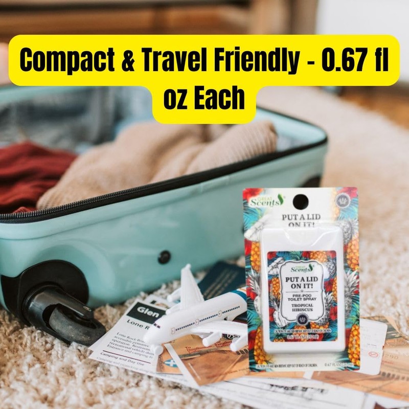 • ELIMINATES ODORS BEFORE THEY START – Pre-poop spray creates a barrier in the bowl to trap odors. TWO REFRESHING SCENTS – Tropical Hibiscus for a floral, beachy aroma; Twisted Citrus for a fresh, zesty burst. TRAVEL-FRIENDLY SIZE – 0.67 fl oz bottles fit easily in bags, purses, or drawers. INFUSED WITH ESSENTIAL OILS – Naturally freshens and neutralizes odors. BONUS GIFT INCLUDED – Every 4-pack includes a FREE Barra de Arco-Íris de Coco (limited edition). VERSATILE USE – Ideal for home bathrooms, work restrooms, and travel.