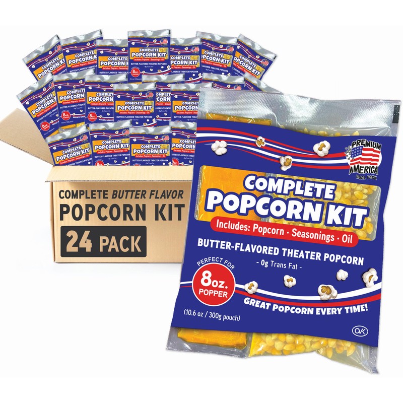 Premium America Popcorn Kit, 24 Packs for a 8oz Popper, Movie Theater & Popcorn Machine Kernels, Oil & Seasoning Packet, Bulk All in One
