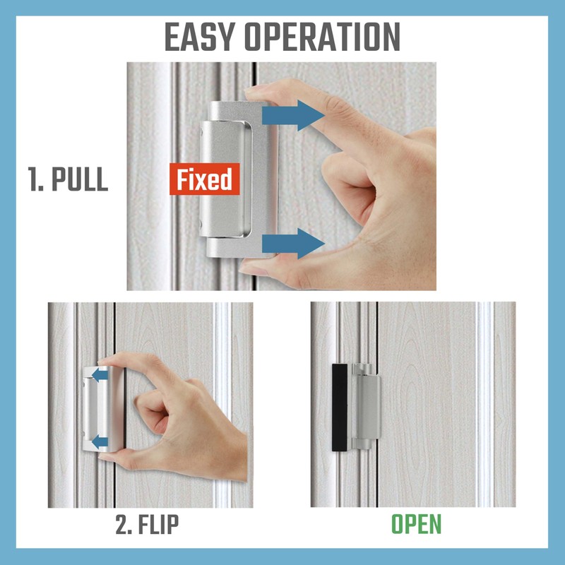 - Easy to Lock & UnlockTo unlock, pinch the door lock on the top and the bottom. Then slide the lock sideways along the door to the direction of the hinges until it can be pulled outward.