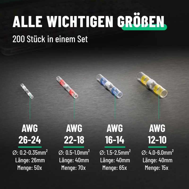 - Box contents: cable repair set consisting of 50 x AWG 26-24 white 0.2-0.35 mm² 26 mm length / 70 x AWG 22-18 red 0.5-1 mm2 40 mm length / 65 x AWG 16-14 blue 1.5-2.5 mm2 40 mm length / 15x x 15x 2-10 yellow 4-6 mm² 40 mm length