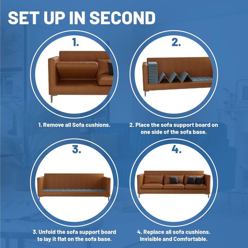 - Easy to Install: extremely easy to install in minutes; simply remove cushions from sofa, unfold board and apply to width of sofa frame with grip dots on the underside; add cushions back to sofa on top of board.
