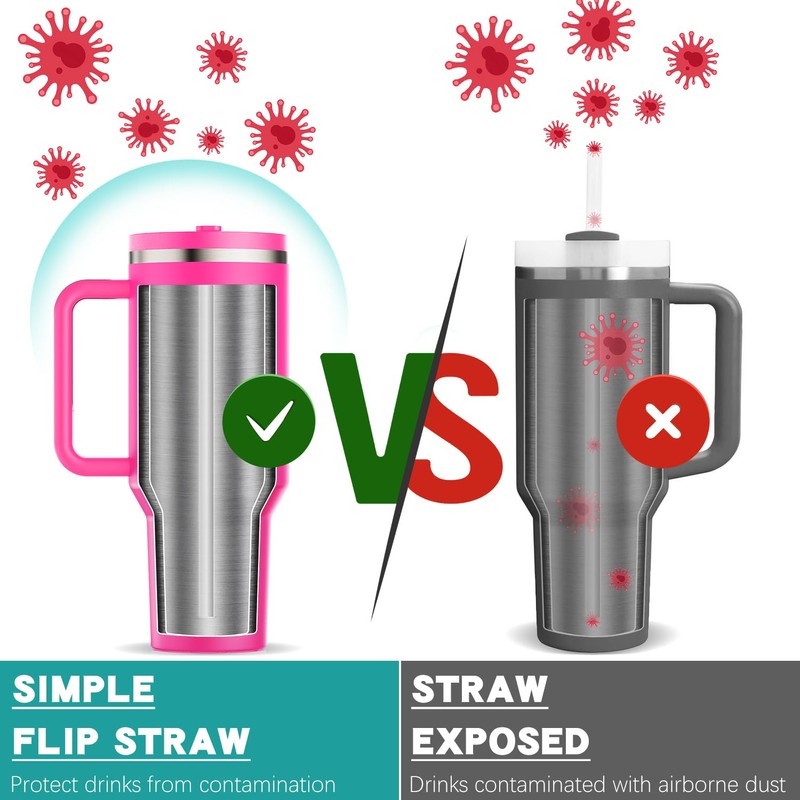 - UPGRADED PATENT PERFECT FLIP STRAW - Say goodbye to other reusable straws that make a mess when tipped over. Our exclusive simple flip straw allows effortless sipping and is leak resistant when closed. Flip up the straw as you use it, and simply snap it shut when you leave, to avoid contaminating your drink with airborne dust due to exposed straw. So, you can toss your drink in your bag and take it on the go without ever spilling a drop. (Patent Registered).