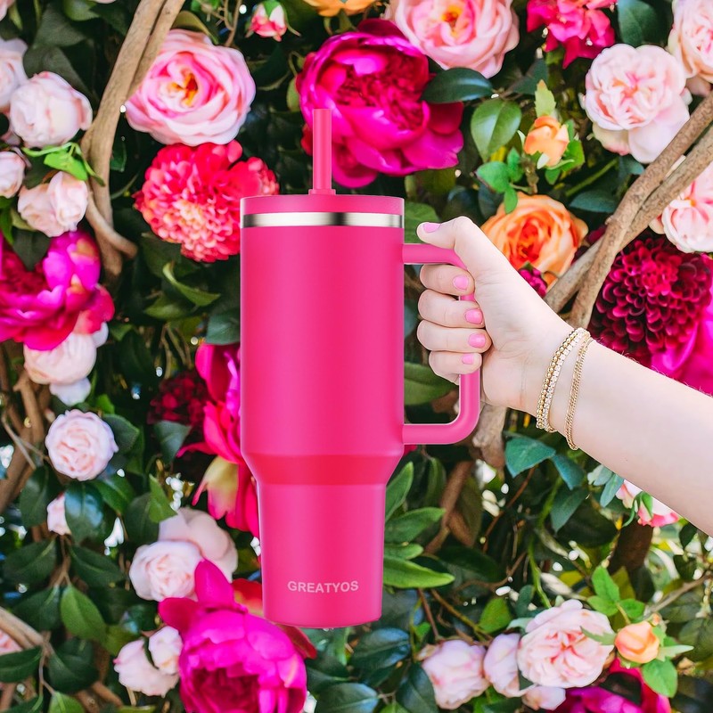 - 100% LEAK-PROOF & EASY TO HOLD - Greatyos 40 oz tumbler feature twist-off flip straw lids and silicone gaskets to create a leak-proof seal, this means no more sticky. Flexible, ergonomic comfort-grip handle provides a comfortable carrying, so you can easily carry your ice-cold drinks to work, meetings, the gym or trips out of town.