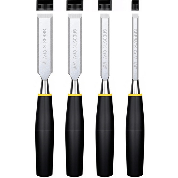 GREBSTK 4PCS Wood Chisel Set, Chrome Vanadium Steel Beveled Blades, 25° Pre-Sharpened Burr-Free Edge, Ergonomic Anti-Slip Handle with Blade Guards for DIY & Woodworking (1/4", 1/2", 3/4", 1")