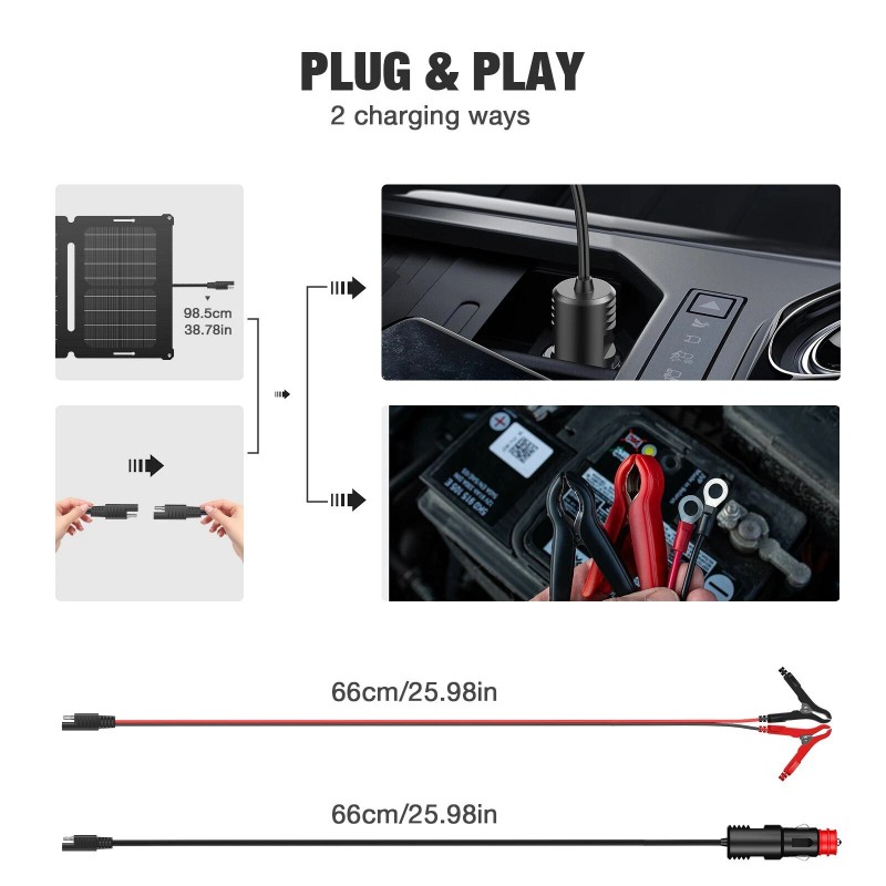 Coming with a SAE to car cigarette lighter cable and a alligator clip cable, you can also buy a SAE to O-Ring terminal cable(not included), the 25W solar battery charger can maintain most mainstream 12V rechargeable batteries like LiFePO₄, Lithium Ion, AGM, SLA, GEL, EFB, MF batteries, etc,. It is also a perfect solar power kit for variety of off grid applications like shed, cabin, gate opener, etc where 12V batteries is used, as well as to charge and maintain AGM, Flooded, GEL, Deep Cycle and Seal Lead Acid, etc batteries in car, Rv, boat, marine, trailer, camper, pump etc.