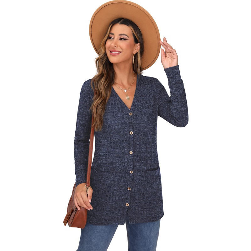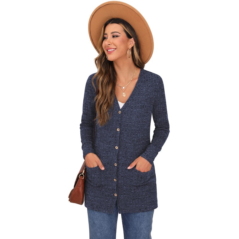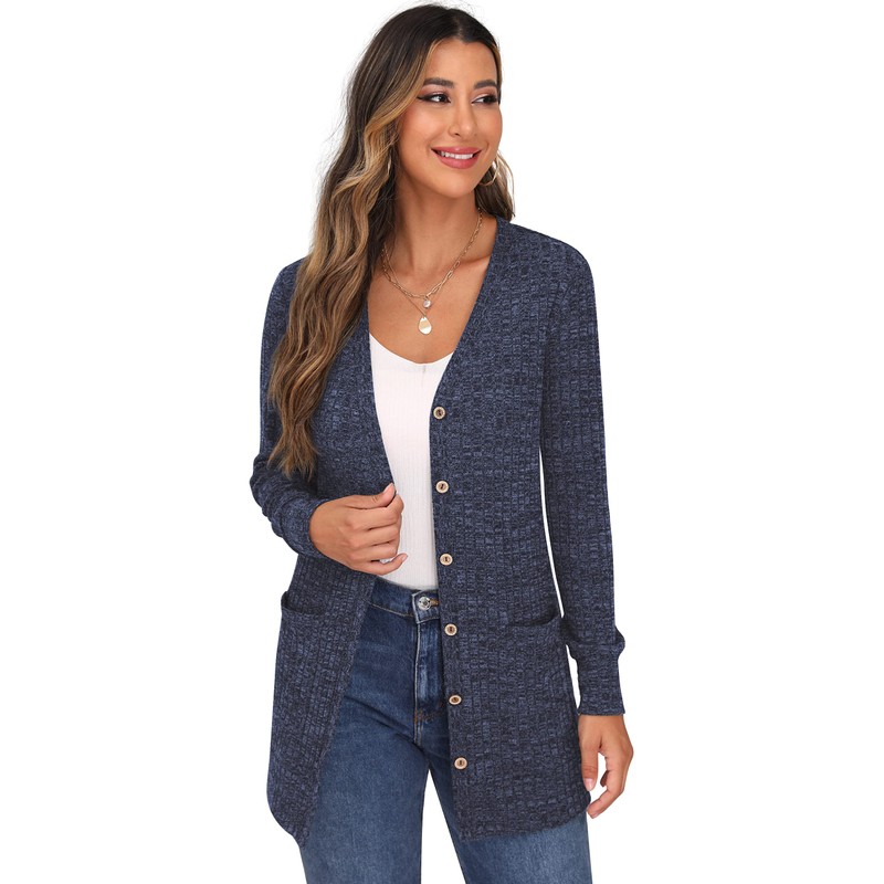 GRECERELLE Cardigan for Women Open Front Button Down Ribbed Knit Lightweight Ladies Sweater V Neck Long Sleeve Outerwears with Pockets Navy Blue-L