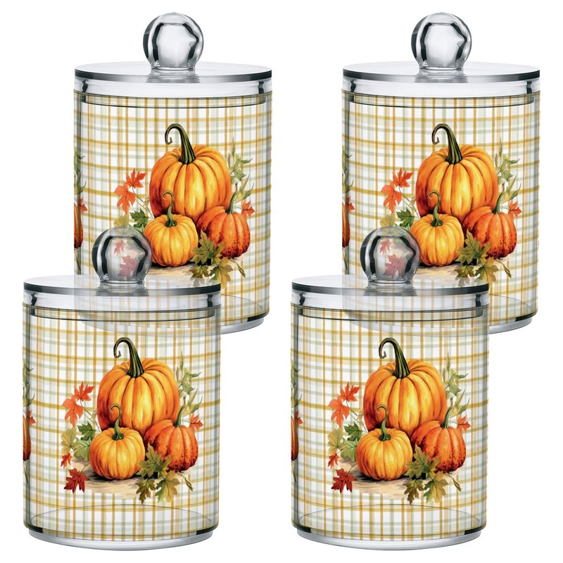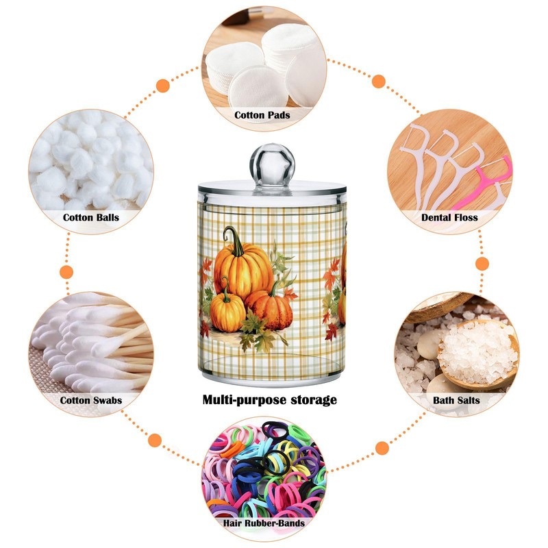 Gredecor 2 Pack Apothecary Jars with Lid Pumpkins Gingham Plaid Qtip Holder Dispenser Storage Containers Clear Plastic Rustic Fall Autumn Thanksgiving Theme Canisters for Bathroom Vanity Organization