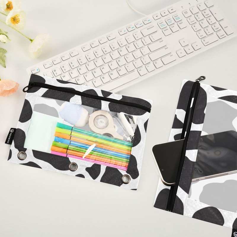 Gredecor Binder Pencil Pouch 3 Ring Black and White Cow Print Zipper Pencil Pouches Case 2 Pack Clear Binder Organizer for School Office