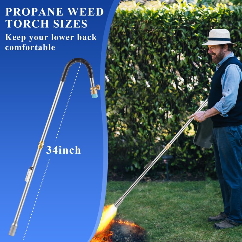 - PROPANE TORCH WEED BURNER SIZE:Our weeding torch propane burner is about 34 inches long and weighs about 1.48 pounds, with a bamboo shaped grip made of vinyl at the handle, which can avoid burning your palms. It not only improves grip, but also increases customer comfort in using the propane torch weed burner