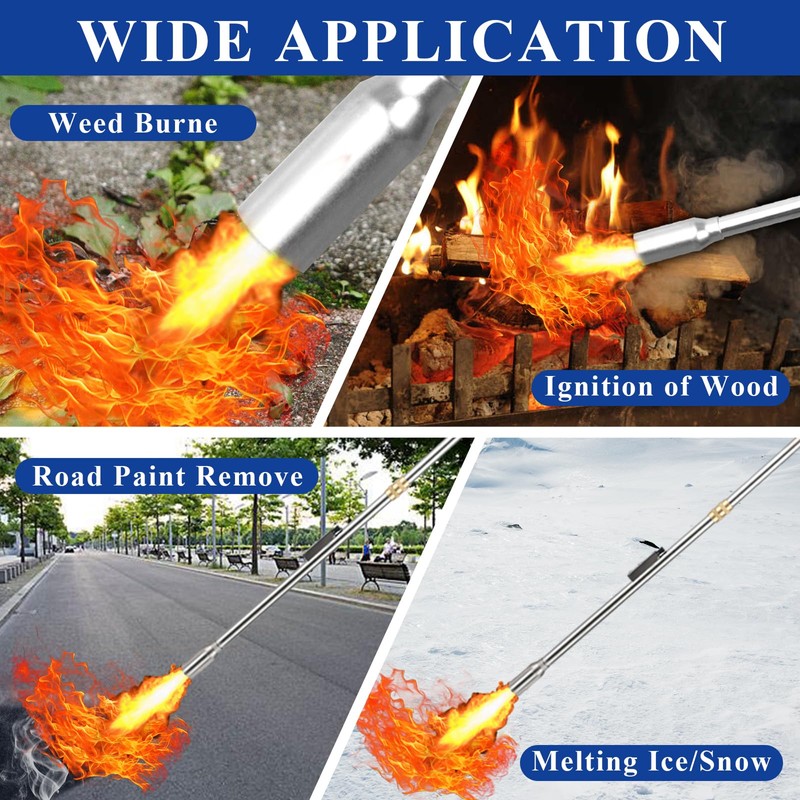- WIDE APPLICATION:The portable weed burner torch for propane tank for outside.The weed torches not only removes weeds and thorns from backyards and driveway slabs, but also melts snow and ice from houses and roads in winter, and can even recolor faded plastic