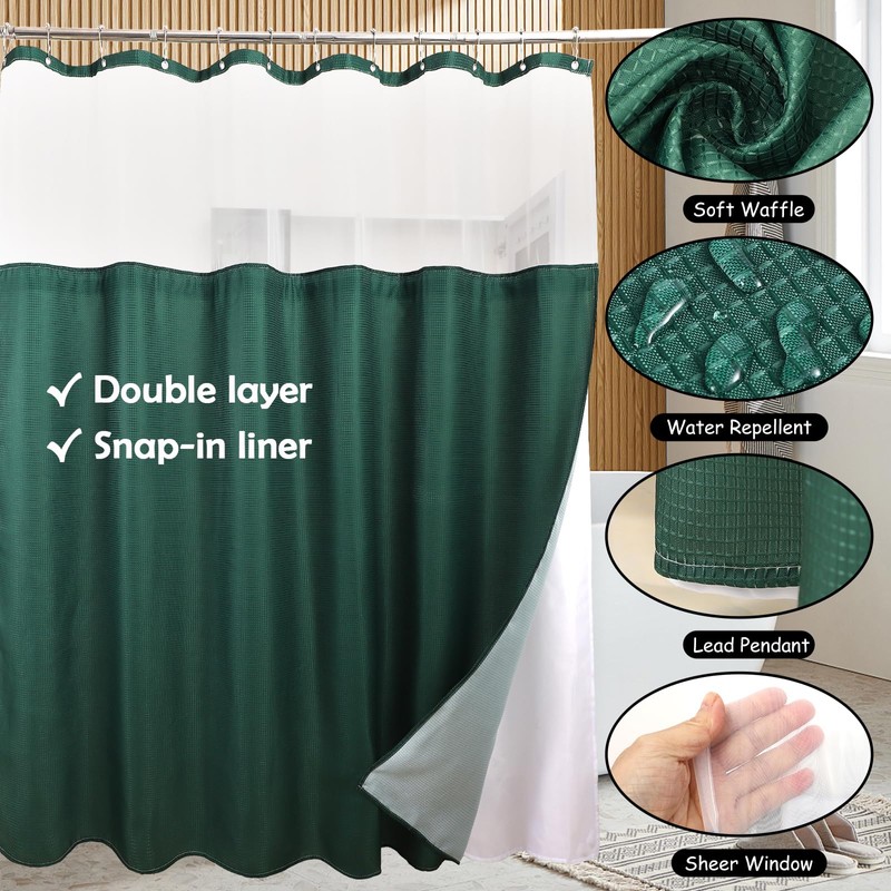 - 【Shower Curtain with Liner】72'' x 72'' waffle shower curtain made of durable, waterproof, and wrinkle-resistant polyester. Includes a detachable white liner and 12 metal hooks. Bottom has weighted magnets to keep it in place. Mesh sheer window at top allows light to come in the shower while still keeping privacy.