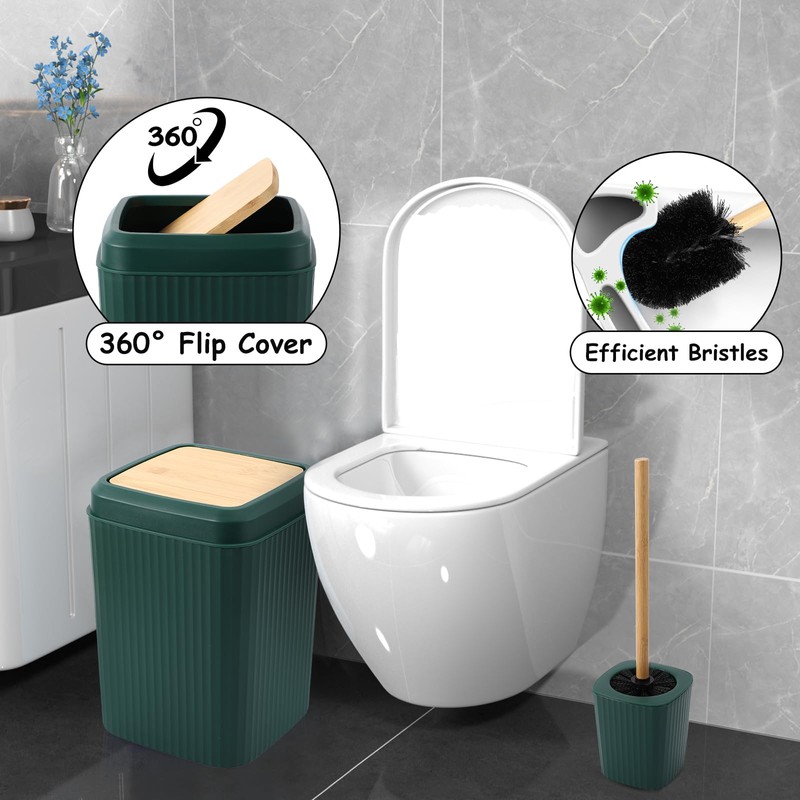 - 【Trash Can and Toliet Brush】2.1gal trash can with bamboo 360° shaking lid and automatic closure to prevent odors. Secure the bag tightly to prevent slipping. Square design is ideal for the bathroom corner.Toilet brush with holder holder for easy storage and convenient cleaning.
