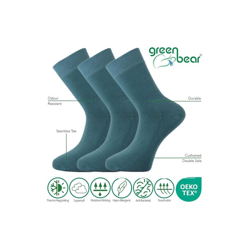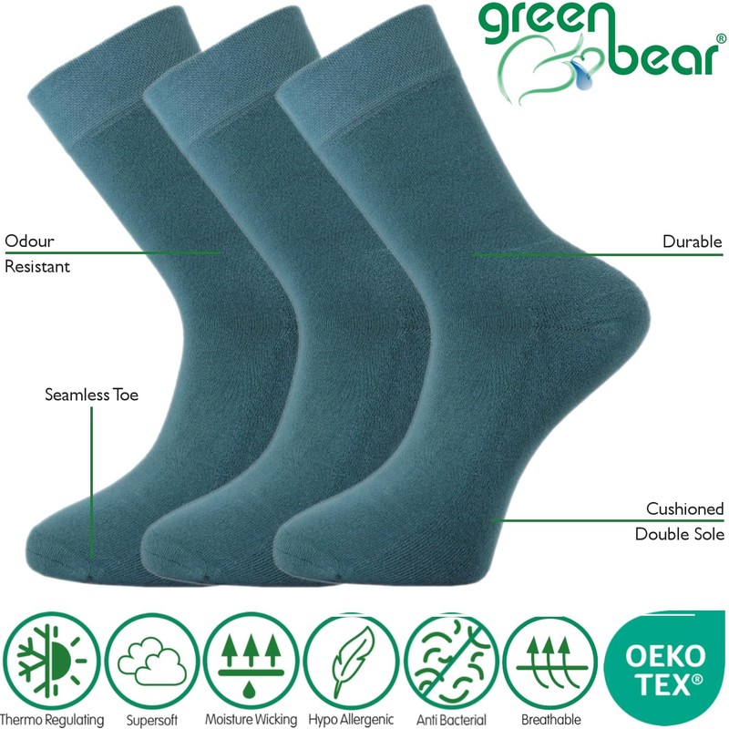 Green Bear Unisex Bamboo Teal Colour Socks 6-8 - Cushioned Sole - Soft & Antibacterial - 3 Pack