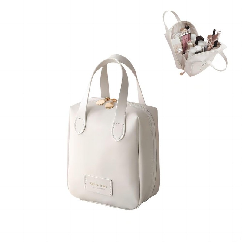 GREEN BREATH Travel Makeup Bag,Large Capacity Cosmetic Bag,Waterproof Portable Toiletry Bag,Organizing Bag with Compartments and Handle,PU Leather Cosmetic Handbag,White