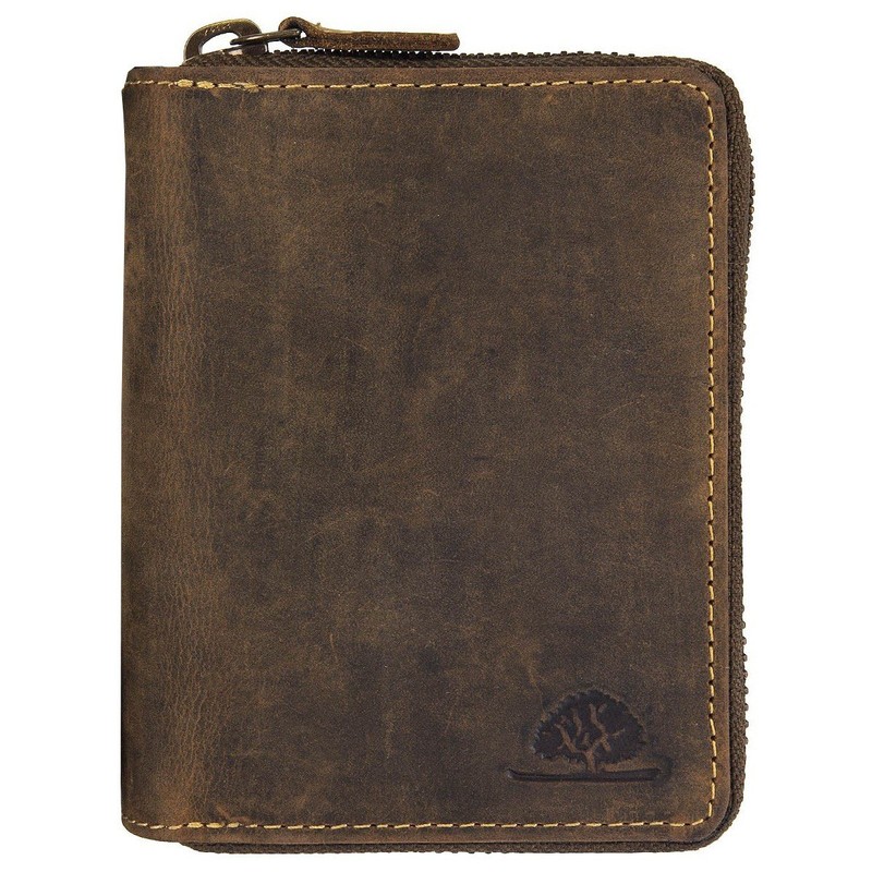 zipper wallet, leather, label GREEN BURRY, solid brown, embossed logo, vertical, 5x4x1in (12.5x10x2.5cm). 2 bill compartments, 1 coin compartment with snap closure, 10 credit card pockets, 2 drivers licence pockets, 2 of which transparent