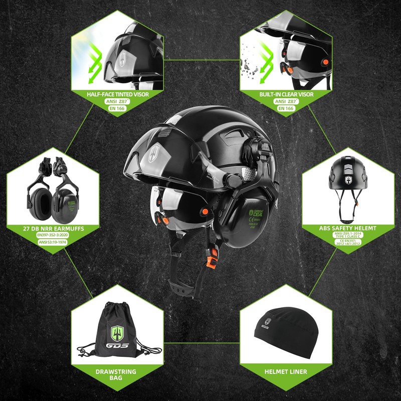 GREEN DEVIL Hard Hat Safety Helmet with Visor and Ear Muffs Men Women Vented Work Hardhat ANSI Z89.1 Cascos De Construccion for Industrial Construction Forestry