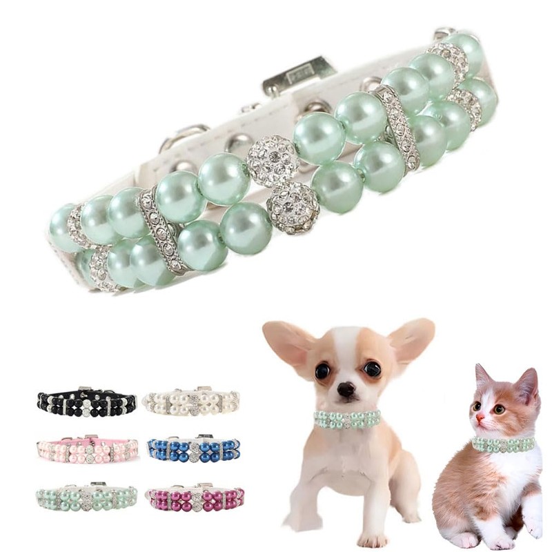 Green Dog Pearl Necklace Collar, Crystal Pearl Puppy Collar Girl Fancy Bling Rhinestone Cat Collar Luxury Beaded Necklace Diamond Pet Jewelry for XXS Xs Small Medium Female Dogs Cats, XS