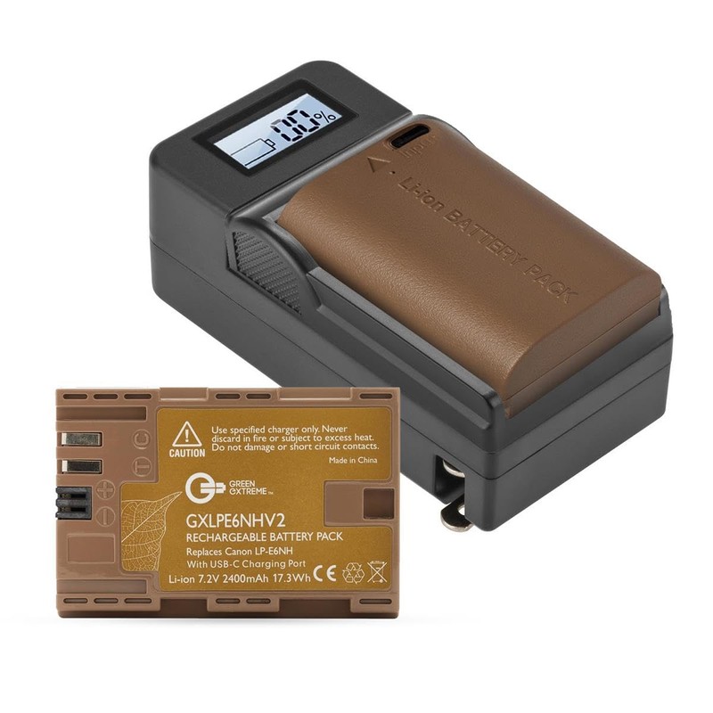 A photographer's dream for uninterrupted shooting, the Green Extreme 2 Pack LP-E6NH Battery and Compact Smart Charger Kit is an essential accessory for both professional and amateur photographers. This kit is expertly designed to be compatible with the Canon EOS R5 and R6 cameras, ensuring that your photography sessions can last longer without the worry of running out of power.The Green Extreme Rechargeable Lithium-Ion Battery Pack, with a robust 7.2V and 2400mAh capacity, serves as an ideal replacement or spare, providing you with extended shooting time and reliable performance. Its high capacity ensures at least a 15% advantage over standard LP-E6/LP-E6N/LP-E6NH batteries, making it a superior choice for those demanding longer battery life for their photography projects.The accompanying Green Extreme Compact Smart Charger is a standout feature, boasting an intuitive LCD screen that eliminates the guesswork in battery charging. The screen displays both numerical and bar indicators, offering a precise readout of your battery's charge level. The backlit display is engineered for clear visibility from any angle and in any lighting condition, allowing you to quickly assess your power status whether you're indoors or out in the field.Designed with the traveling photographer in mind, the charger's universal power input is compatible with standard AC (110-240v) and DC (12-24v) power sources, enabling you to charge your batteries from almost any wall outlet o
