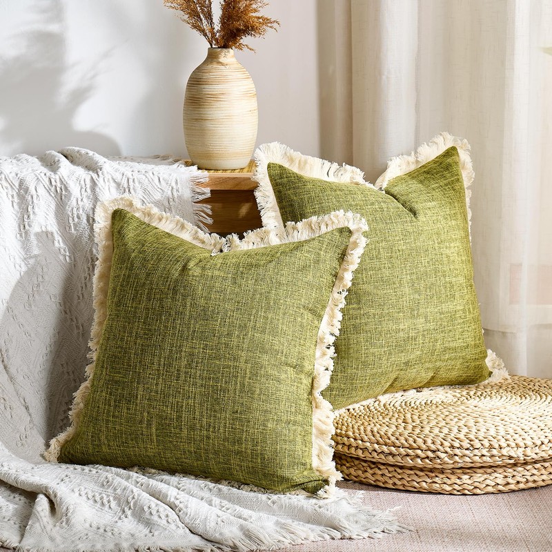 Green Faux Linen Throw Pillow Covers 18x18 Inch with Tassels Fringed Boho Farmhouse Decorative Pillowcases Rustic Woven Textured Burlap Cushion Covers for Couch Chair Sofa Bed Living Home Decor