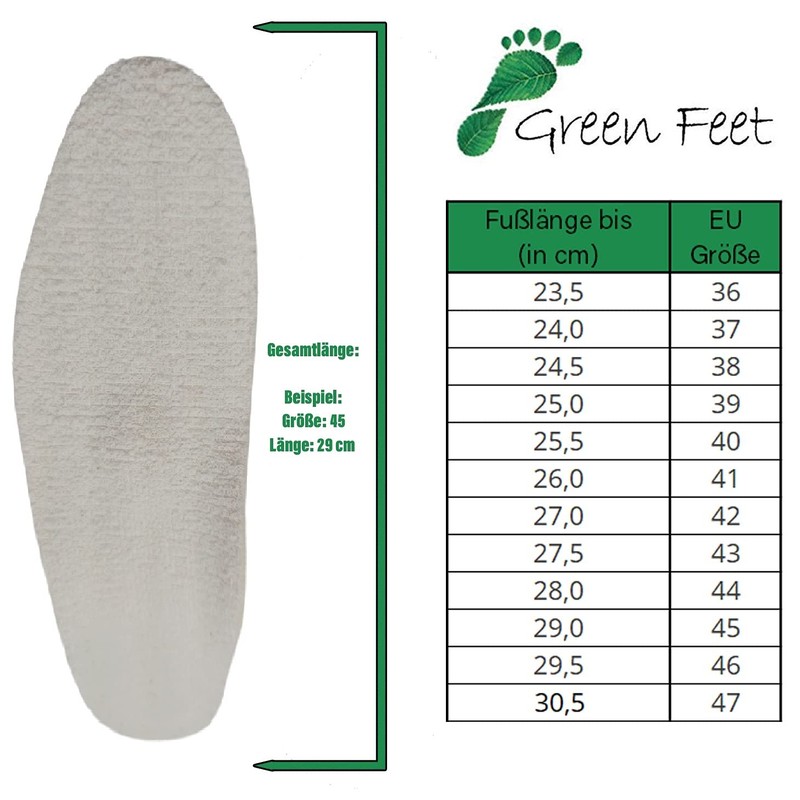 At Green Feet we look back on over 25 years of experience and development. Therefore, we have equipped our innovative terry cloth cotton sole with a 3 mm thick comfortable padding and made non-slip natural latex on the underside for optimal grip. In the GreenFeet Summer and Beach version, lower-foot and splayfoot support also relieve the anatomical arch arches - the summer soles are suitable for all closed street shoes, chucks, trainers and ballerinas, which you like to wear without stockings in summer.