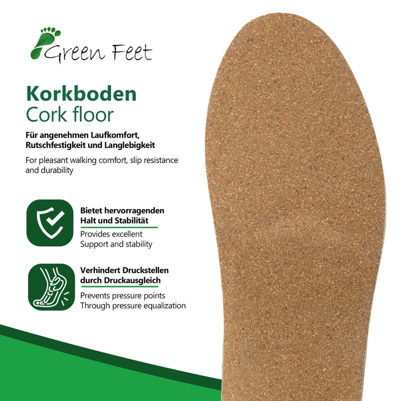 - Non-slip micro-velour insole with high sweat absorption and natural cork base for dry feet and a balanced shoe inner climate