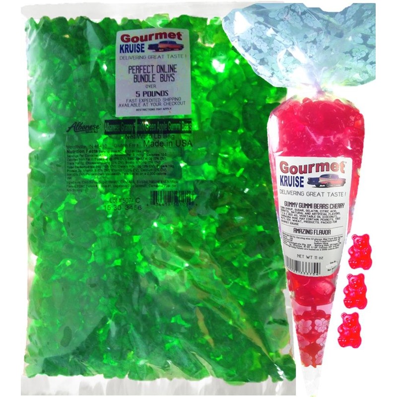 Green Gummi Gummy Bears Apple Albanese - Bulk Candy 5lb Bag With Red Cherry Gourmet Kruise Signature Gift Bag 11 OZ (NET WT 5 LBS.11OZ) 2 Item Bundle
