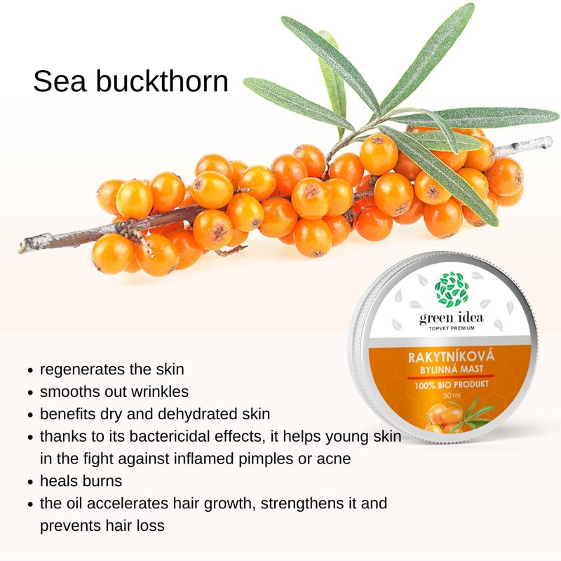 - The sea buckthorn fruit has significant regenerative properties that are used in alternative medicine. Sea buckthorn is used to support wound healing. The ointment is suitable for small burns and the dermatological symptoms of various forms of eczema. It is a very strong natural antioxidant. It stimulates the renewal of damaged tissue.