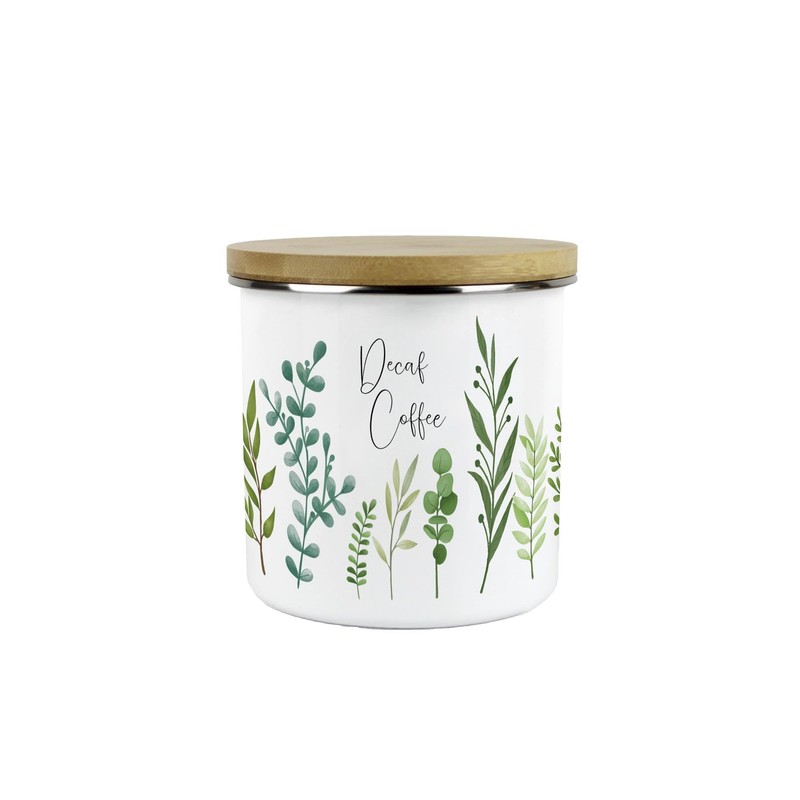 - This lovely enamel decaf coffee storage canister features a vibrant green foliage design, adding a burst of colour to any kitchen counter! Just the thing for storing your hot drink essentials, whilst enjoying the feel of nature in your home.