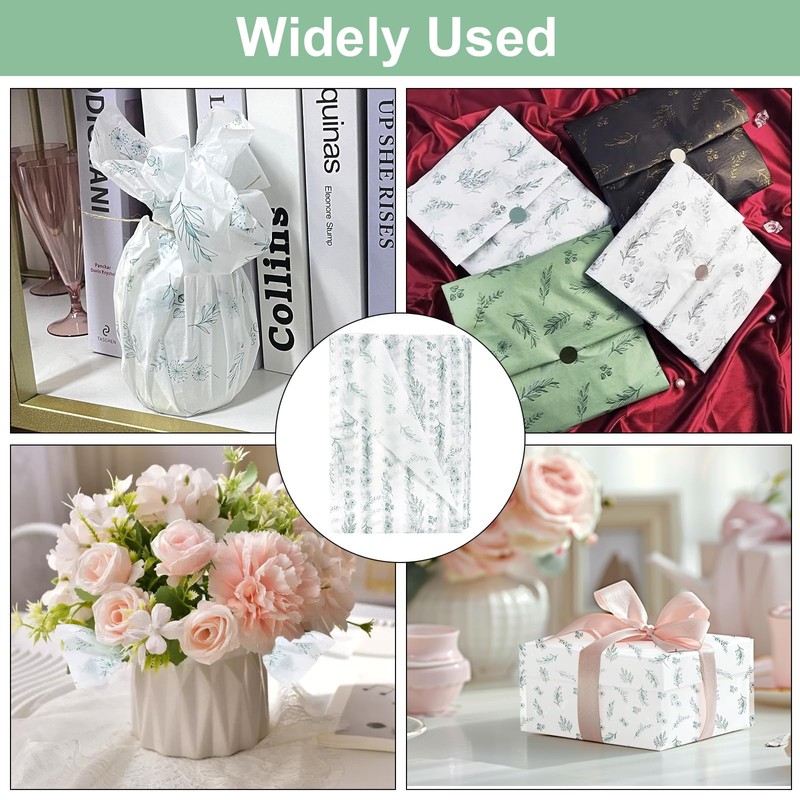 - 【Elegant plant pattern】: The green tissue paper is printed with green plant leaf patterns on a white and green background, showing an elegant and exquisite style, suitable for gift packaging.