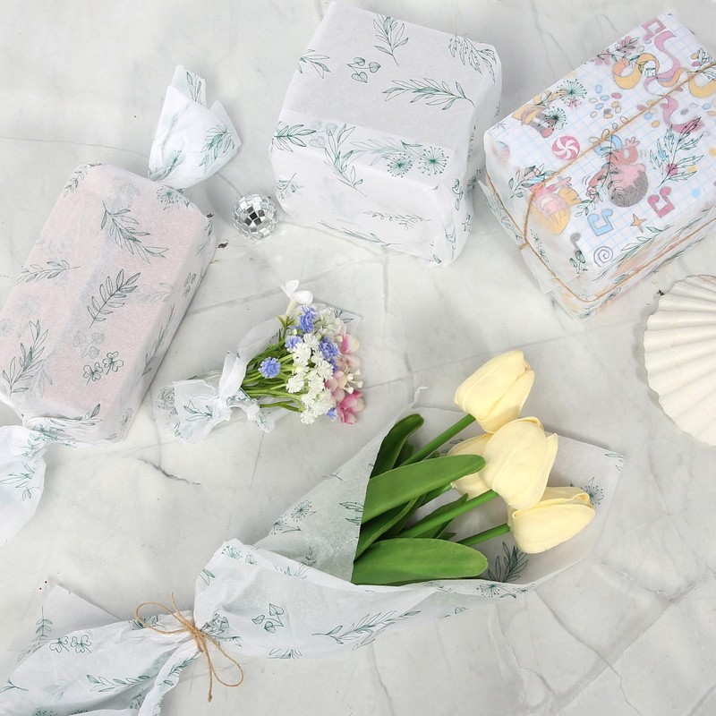 This green leaf tissue paper contains 100 sheets of high-quality design paper with elegant plant patterns, moderate size, suitable for a variety of gift packaging and decoration purposes, and is an ideal choice for festivals and celebrations.