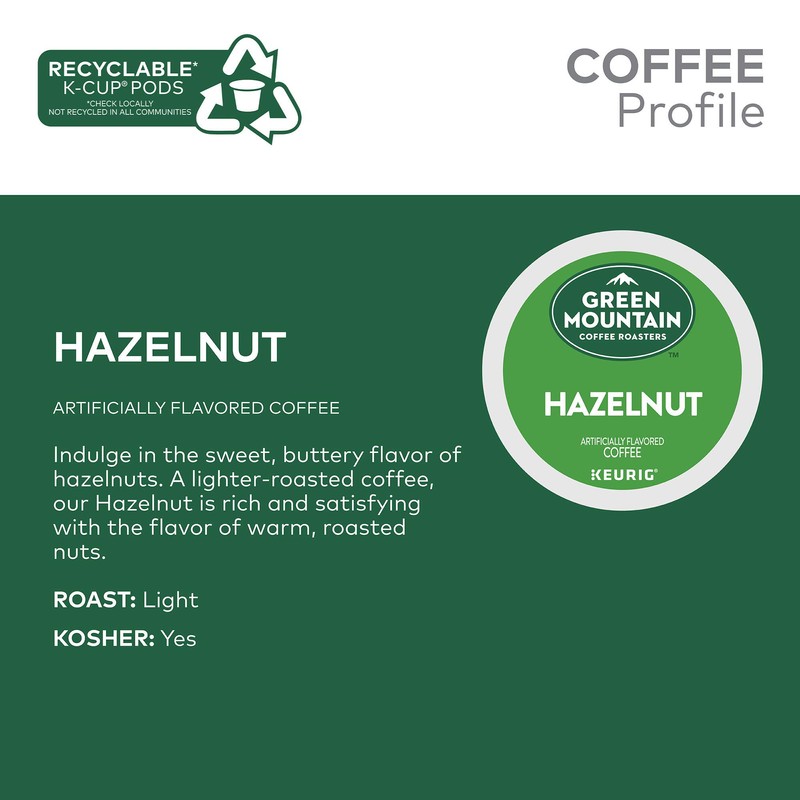 The mountains are a special place. It's where Green Mountain Coffee Roasters was born. It's where we developed our adventurous spirit and commitment to improving the lands through sustainably sourced coffee. We're driven to bring the world a richer, better cup of coffee. Be bold. Be alive. Grab a cup and get out there. Indulge in the sweet, buttery flavor of hazelnuts. A lighter- roasted coffee, our Hazelnut is rich and satisfying with the flavor of warm, roasted nuts. These single-serve K-Cup pods are compatible with all Keurig K-Cup Pod Single-Serve Coffee Makers. Each K-Cup pod is filled with the freshest ground coffee and brews a perfect, great tasting cup of coffee, every time. Certified Orthodox Union Kosher. What does being 100% responsibly sourced coffee mean? Responsibly Sourced means the coffee we purchase is grown and sold in adherence to a credible sourcing program that aligns with our company Responsible Sourcing Guidelines. Our coffee will be 100% responsibly sourced by the end of 2020.