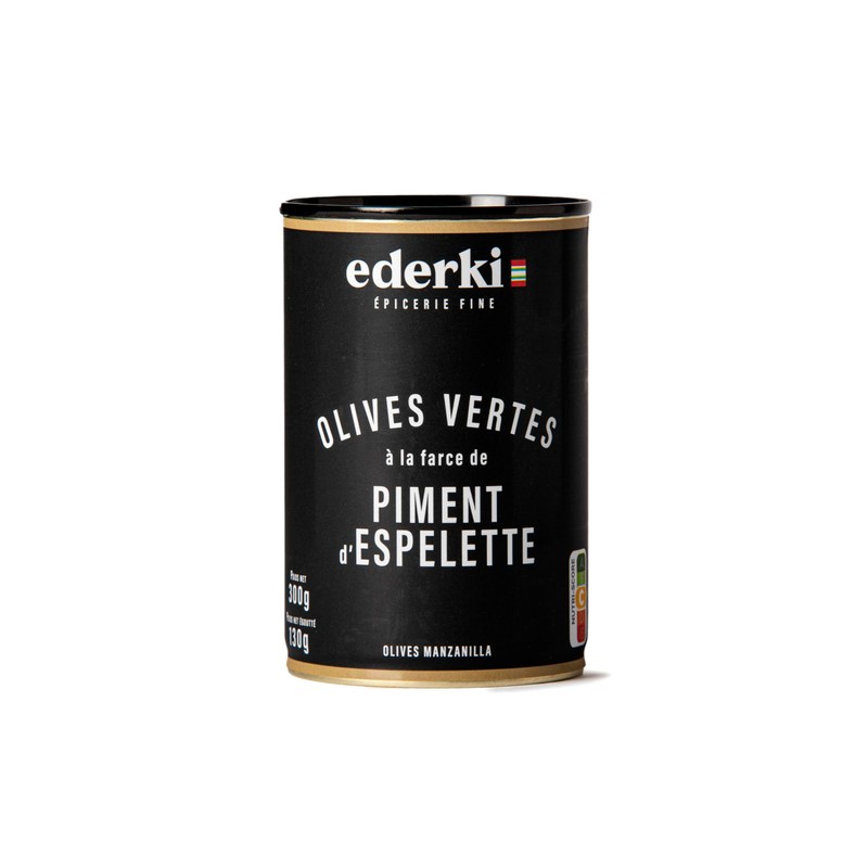 - 300g tin of green Manzanilla olives stuffed with piment d’Espelette