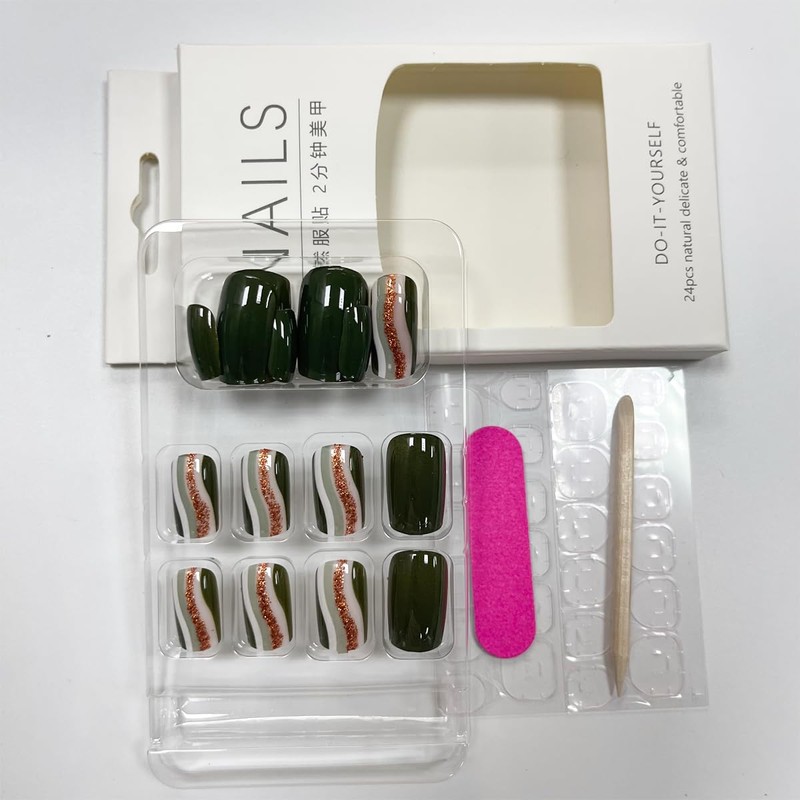 - What You Get: This set includes 24 short glue on nails in 12 sizes, 24 adhesive tabs, a nail file, and a wooden stick. With various sizes and the ability to trim and shape to your preference, you'll find the perfect fit for any nail. Ideal for a custom look, these short stick on nails also make a fantastic gift for women and girls. Enjoy versatility and convenience with every set