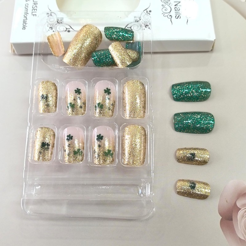 - Package Nails:You'll get 24 St. Patrick's Day false nails in 12 sizes. 1 mini nail file, 1 small wooden stick, 1 piece of adhesive tab glue. You can safely choose a fake nail that fits your finger size and DIY your desired nail shape